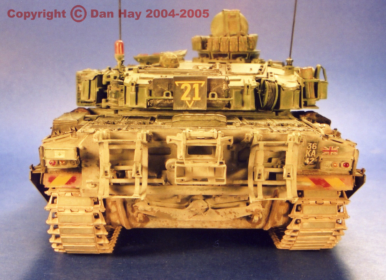 Above are some photos of the kind-of finished model. Since these very poor quality photos were taken, I have reworked the weathering several times as I thought the first attempt was far too heavy handed. I have also added various bits of crew gear and stowage to the turret in the recent past. These pictures however represent the model as it appeared in September of 2004 after it was finished and weathered for the first time; it now exists in a much more subtly weathered state. More photos - this time with Fruil tracks and completely re-worked weathering